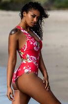 Stunning one piece swimsuit featuring a beautiful floral design and scalloped edge trim. This swimsuit features lightly padded wire free cups and adjustable shoulder straps.