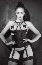 Powerful Satin Elastic sewn together to create a form fitting OPEN BUST BUSTIER with strappy detailing 3 row hook back closure removable and adjustable garters and comes with a G String. Comes with CROSS PASTIES. Color: Black. Sizes: 32-34-36-38. Shown with #90370 Studded Back Seam Fishnet Stockings.