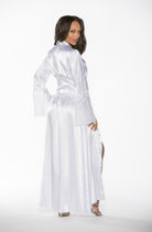 Elegant and sexy this charmeuse lace and chiffon long robe is Hollywood glamour at its finest! A gorgeous lace trimmed bodice with a padded shoulder seam a fitted waist wide ribbon belt and sheer flared sleeves. Comes with side pockets and inner tie. Avaliable in black white and red. Image of the back shown in red for illustrative purposes. (Also available in Plus Sizes - see X20559 for further details).