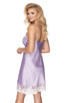 A charming and original nightdress made of the highest quality satin combined with a beautiful lavender and cream lace in a floral pattern. The cups are decorated with this gorgeous lace. At the bottom the nightdress is also finished with this lovely deep lace. Thin adjustable straps. Length above knees. Andromeda arrives packaged in a lovely Irall box making it ideal for a special gift or treat. Also available in other styles. The Andromeda collection comprises Nightdress Set or Dressing Gown making it ideal for mix and match. Please see the 'related products tab' for these further styles.