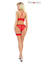 A stunning two piece set made in really lovely soft lacey fabric with deep eyelash lace frill. The bra top fastens at the front. The stunning briefs have wide satin ribbon ties. This item is packaged in a Provocative box. Also available in black please see related products. (note the garter is not included).