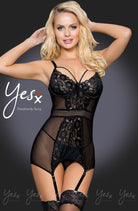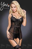 An irresistible chemise with elegant floral lace and sultry sheer fabric. The chemise has adjustable shoulder straps and arrives with matching sheer fabric thong and removable suspender straps. PLEASE NOTE: Stockings not included. Please see related products.