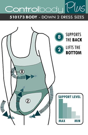 Shaping body with wide straps. Firm compression providing a high level of support. Shapes the waist lifts the bottom smooth the tummy supports the bust and supports the back. Anti-bacterial gusset. Item comes packaged in a Control Body box.