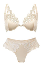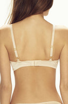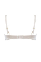 Delicate underwired bra with lightly padded cup to provide shape and support. Adjustable straps with gold coloured metal fittings. Lovely lace and centre ring detail. Hook and eye fastener at the back with three adjustment positions.
